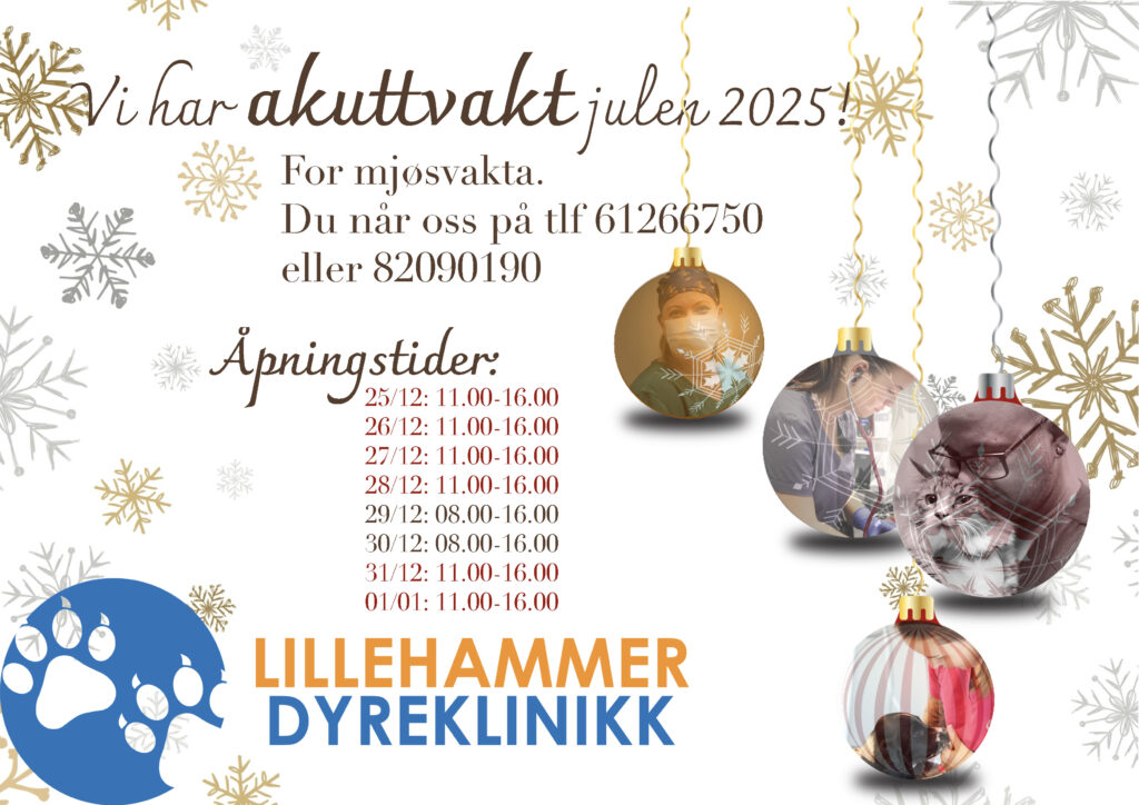 Vi holder akuttvakt hver dag gjennom hele romjulen, slik at du kan få rask hjelp dersom noe skulle skje med kjæledyret ditt. Har du behov for akutt veterinærhjelp, kan du ringe oss på 61 26 67 50. . Du kan også nå oss via Mjøsvakta på 82 09 01 90.